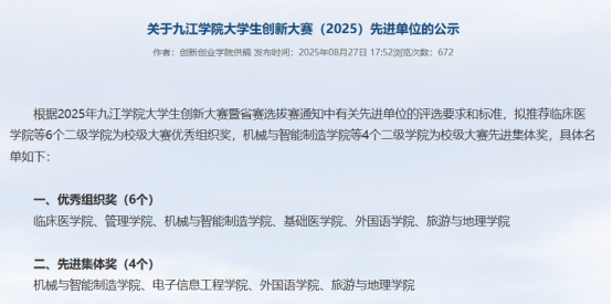 近日,九游体育官方网站2025年大学生创新大赛先进单位评选结果公布,九游体育官方网站以学校积分排名第二的成绩,斩获“校级先进集体奖”,九游体育已连续多年在该赛事中荣获殊荣,尽显学院创新创业教育底蕴与创新人才培养的持续进步。