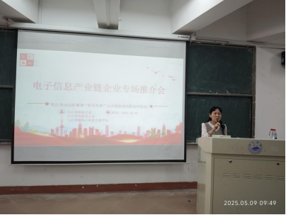 为给毕业生和用人单位搭建双向选择的平台,5月9日,九江市2025年春季“职引未来”公共服务进校园系列活动,电子信息产业链企业专场推介会,在竞知楼阶七教室进行。此次推介会由九江市就业之家、九游体育官方网站就业之家指导,九游体育官方网站九游体育官方网站承办,九江市就业创业中心朱敏副主任,电子工程学院汪傧书记、张堑副书记参会指导,学生科朱亚军科长、专职就业辅导员盛健组织协调,我校电子学院、计算机学院和材料学院150余名毕业生参加了推介会。