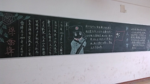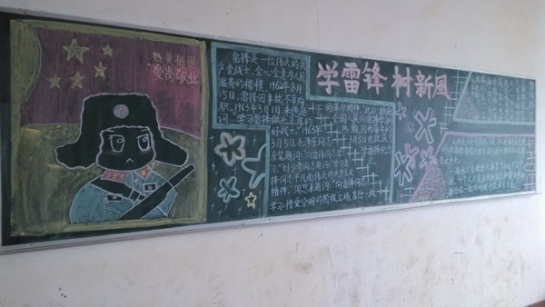 “学习雷锋好榜样”激昂的歌声从未在耳边断绝过,在雷锋日前夕,各班级早已用自己的方式将这位可歌可敬的“雷峰”画在了黑板上,有可爱的卡通人物形象,也有严谨保卫祖国的“小雷锋”,每幅画都是栩栩生动。有些班级将雷峰的一些生平事迹也在黑板上写了下来,图文并茂地展示给同学们。雷峰一生勤劳简朴,乐于助人,其高尚的品质为毛主席所赞。作为新时代的大学生,有义务,有责任学习雷锋精神,乐于助人,奉献自己,写在黑板报上的字,是时时刻刻提醒同学们的警钟,切勿被社会的不良风气所染,要树立正确的人生观、价值观,服务人民,服务社会,为祖国的繁荣奉献自我。