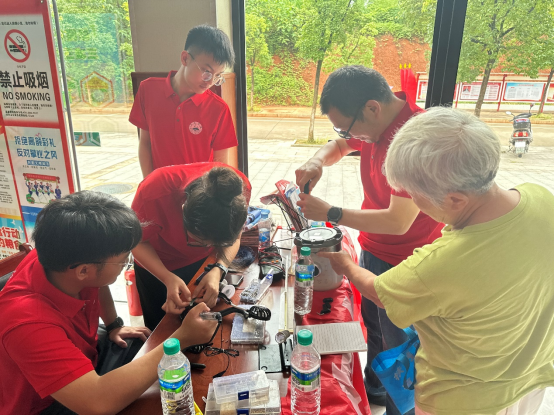 为增强学生用所学专业技术服务社会的信心,又切实解决社区居民生产生活中的难题。作为学院的特色活动,义务维修在此次“三下乡”活动中大放异彩。服务队队员们携带专业工具和设备,在社区内设立了维修站点,为居民们免费维修家电产品。居民们拿着自家有故障的电风扇、烧水壶、电饭煲、微波炉等家电前来维修,队员们细心检查、修理,熟练地卸螺丝、检测、换零件、重装、测试,用自己的专业知识和所学技能,为居民耐心解答各种相关问题,同时进一步向村民们宣传了用电安全知识,并派发了相关安全手册,现场忙碌而有序。义务活动共维修小家电40余件,服务队队员们凭借扎实的专业知识和热情的服务态度,赢得了居民们的一致好评。