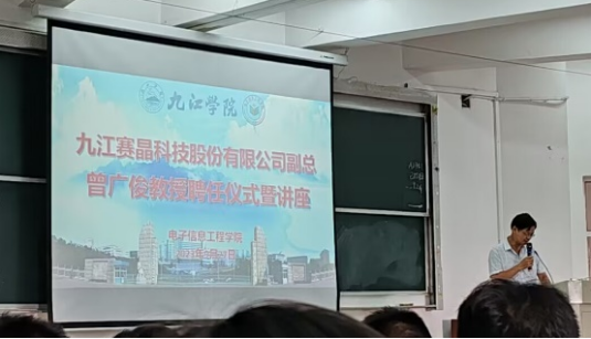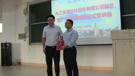 9月27日下午,在竞知楼阶四教室,为九江赛晶股份有限公司技术副总曾广俊举行聘任仪式,聘请其为电子信息产业学院兼职教授,九游体育党委副书记张堑为其颁发聘书,仪式由电子信息产业学院负责人高玉宝主持。
