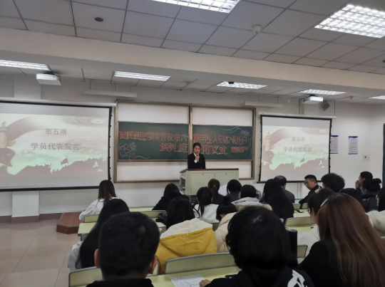 张艺渲同学代表全体学员向党校表明了决心。《学员守则》和培训安排也让大家明确了应该遵守的规章制度和本次培训班的学习计划。希望全体学员在培训期间能严格要求自己,克服时间上、精力上的困难,真正学到知识、达到培训目的,增强党性修养,力争以优异的成绩圆满地完成各项学习任务,取得培训与专业学习上的双丰收。
