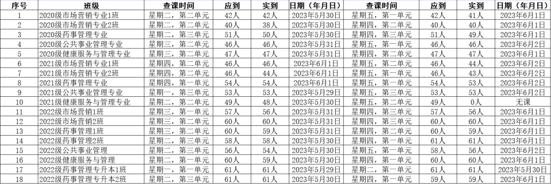 为全面推进本科教育水平评估工作,beat365中文唯一官网党委积极组织学生党员开展查课工作,于6月3日,对第十三周的查课情况做出总结。本周查课以严谨认真的态度对迟到、旷课、带早餐的学生进行了督促和教育。学生党员进入每间教室内检查学生出勤情况。经过一周的督查,学院共查18个班级36节课,覆盖学院全体20级、21级、22级及22级专升本共952名学生。现查课通报如下: