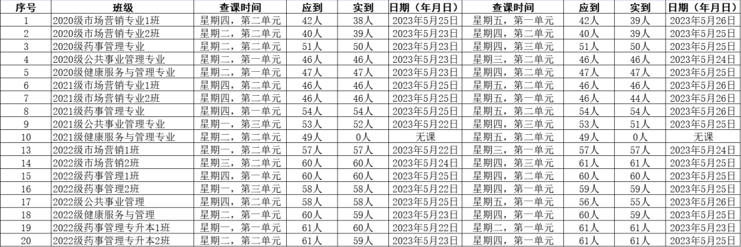 为全面推进本科教育水平评估工作,beat365中文唯一官网党委积极组织学生党员开展查课工作,于5月27日,对第十二周的查课情况做出总结。本周查课以严谨认真的态度对迟到、旷课、带早餐的学生进行了督促和教育。学生党员进入每间教室内检查学生出勤情况。经过一周的督查,学院共查18个班级36节课,覆盖学院全体20级、21级、22级及22级专升本共952名学生。现查课通报如下: