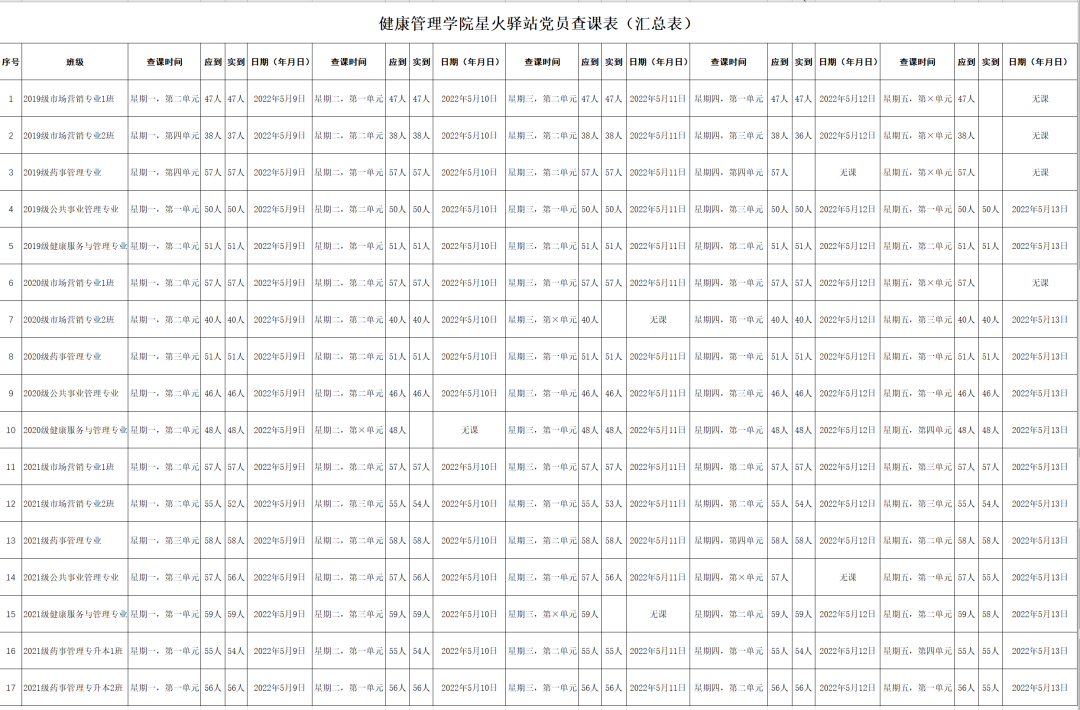 出勤率较好的班级有:2019级市场营销专业1班(出勤率100%)、2019级药事管理专业(出勤率100%)、2019级公共事业管理专业(出勤率100%)、2019级健康服务与管理专业(出勤率100%)、2020级市场营销专业1班(出勤率100%)、2020级市场营销专业2班(出勤率100%)、2020级药事管理专业(出勤率100%)、2020级公共事业管理专业(出勤率100%)、2020级健康服务与管理专业(出勤率100%)、2021级市场营销专业1班(出勤率100%)、2021级药事管理专业(出勤率100%)、2021级药事管理专升本2班(出勤率100%)。