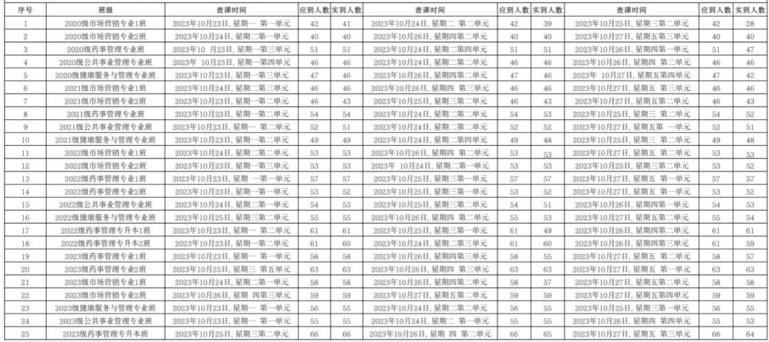为全面推进本科教育水平评估工作,beat365中文唯一官网党委积极组织学生党员开展查课工作,于10月29日,对第九周的查课情况做出总结。本周查课以严谨认真的态度对迟到、旷课、带早餐的学生进行了督促和教育。学生党员进入每间教室内检查学生出勤情况。经过一周的督查,学院共查25个班级75节课,覆盖学院全体20级、21级、22级、23级、22级专升本以及23级专升本共1335名学生。现查课通报如下: