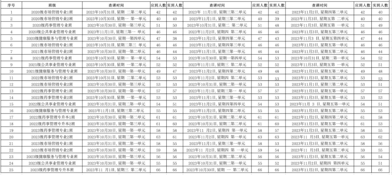 为全面推进本科教育水平评估工作,beat365中文唯一官网党委积极组织学生党员开展查课工作,于11月5日,对第十周的查课情况做出总结。本周查课以严谨认真的态度对迟到、旷课、带早餐的学生进行了督促和教育。学生党员进入每间教室内检查学生出勤情况。经过一周的督查,学院共查25个班级75节课,覆盖学院全体20级、21级、22级、23级、22级专升本以及23级专升本共1335名学生。现查课通报如下: