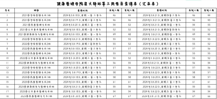 为加强学院学风建设,规范课堂秩序,营造良好学习氛围,于3月25日,对第三周的查课情况做出总结。本周查课以严谨认真的态度对迟到、旷课、带早餐的学生进行了督促和提醒。学生党员进入每间教室内检查学生出勤情况。经过一周的督查,学院共查18个班级36节课,覆盖学院全体21级、22级、23级以及23级专升本共982名学生。现查课通报如下: