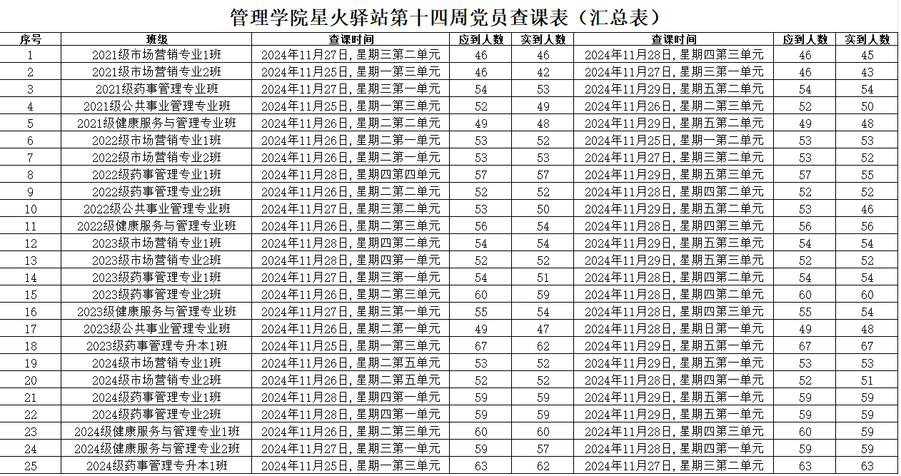 为加强学院学风建设,规范课堂秩序,营造良好的学习氛围,beat365中文唯一官网党委积极组织学生党员开展查课工作,于12月1日,对第十四周的查课情况做出总结。本周查课以严谨认真的态度对迟到、旷课、带早餐的学生进行了督促和提醒。学生党员进入每间教室内检查学生出勤情况。经过一周的督查,学院共查25个班级50节课,覆盖学院全体21级、22级、23级、24级以及23级专升本共1367名学生。现查课通报如下: