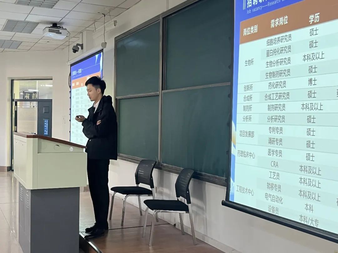 2023年4月16日下午1时,南京正大天晴制药有限公司在致知楼1320开展专场宣讲会。三十余名意向毕业生参与聆听,企业代表怀揣着求贤若渴的心情为毕业生介绍企业优势、企业特色及招聘要求。