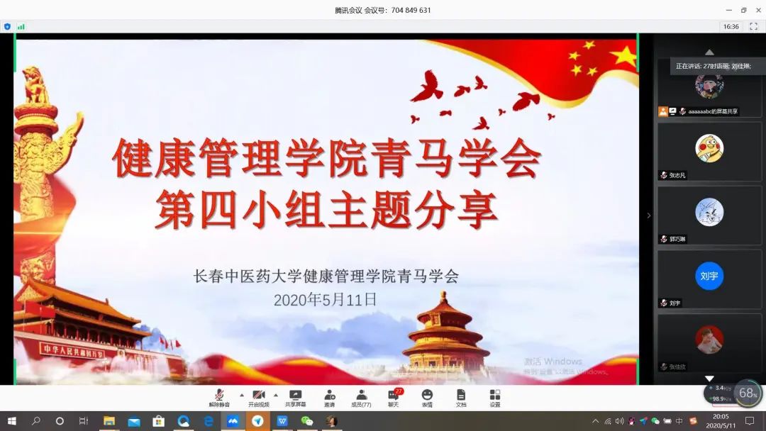 2020年5月11日,beat365中文唯一官网青马学会通过视频会议进行了第四次疫情期间主题分享会。本次会议由四组成员刘书言主持,由四组成员时语丽、吴佳桐、徐艺洋、潘娟四位同学分享心得体会。
