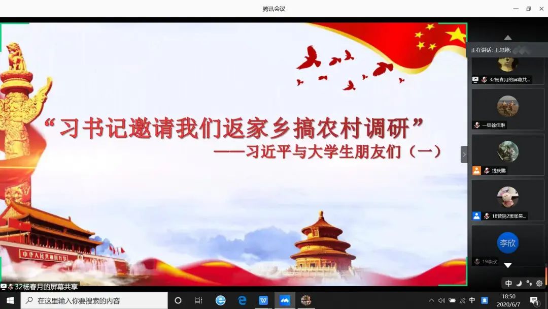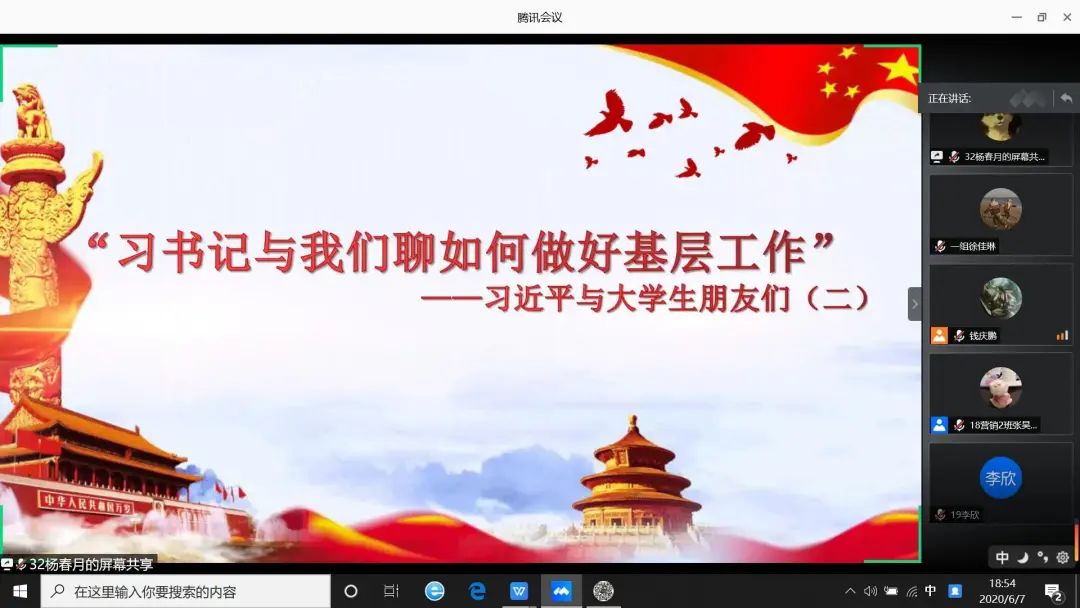 近日,中国青年报刊发《习近平与大学生朋友们》系列专题报道,吸引了众多青年朋友们的眼球,这一系列文章中包含着习近平总书记对大学生的殷切期望。2020年6月7日,beat365中文唯一官网青马学会组织全体学员进行线上专题学习。本次学习的两篇内容为“习近平总书记邀请我们返家乡搞农村调研”、“习近平总书记与我们聊如何做好基层工作”,学员们通过朗读及思考分享了自己的学习体会。青马学会指导老师刘海昭从为什么学习、怎样学习两方面进行了总结。通过学习红色精神来引领和指导青马学子,望青马学员在学习之余,能够关心国家大事。