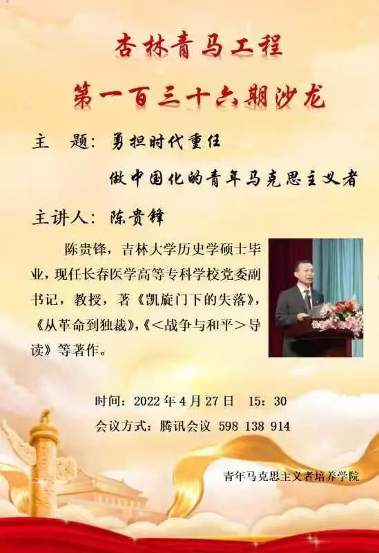 2022年4月27日,beat365中文唯一官网杏林青马工程以“勇担时代重任,做中国化的青年马克思主义者”为主题举办第一百三十六期文化沙龙活动。本次文化沙龙由长春医学高等专科学校党委副书记,教授陈贵锋担任主讲嘉宾。