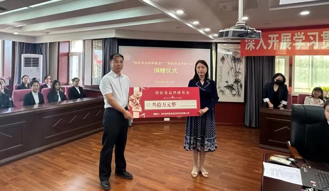 签约仪式上,吉林省特医食品生物科技有限公司董事长赵国安代表公司向学校捐赠“科研基金”三十万元、“奖助学金”三十万元,总经理康明与副院长温红娟签署“特医食品科研基金捐赠协议”。
