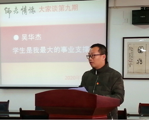 吴华杰老师从03年大学毕业来到九游体育官方网站,16年来,他先是当专任教师,然后转为实验室岗,后面又转为行政岗。岗位在变,但是他喜欢跟学生打成一片的感觉和习惯没有变。他说:“那是我的初心和使命!”这次讲述,让他再次回顾自己走过的教学、教辅之路,他说他最大的感悟就是这次讲述的题目:《学生是我最大的事业支撑》。他说:“老师,因为学生的需要而成为职业。而教书育人,是一个全面、深入、内在、细致的互动过程。作为老师,天然地、理所应当地就应该多与学生在一起。只有通过与学生的深入接触,才能真正了解学生,从而增强教书育人的针对性、有效性;只有通过与学生的深入接触,才有机会逐步增进师生感情,从而增强教书育人的亲和力、凝聚力;只有通过与学生的深入接触,才能及时发现教学及教育管理中的成败得失,从而不断改进教书育人的方式、方法,乃至激发创新灵感;只有通过与学生的深入接触,才能真正体会到这些学生值得我们用心教导,从而享受教书育人的快乐。”