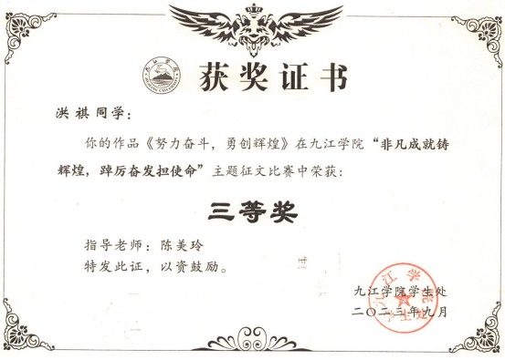 近日,校学生处下发了《关于表彰“非凡成就铸辉煌,踔厉奋发担使命”主题征文获奖的通报》,在此次评选中,九游体育学生两篇征文分获二等奖、三等奖。