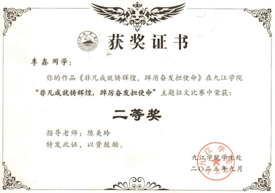 此次征文活动中,九游体育广泛宣传、精心组织,学生积极参与、辅导员认真指导,共收到稿件10余篇,经院内评比上报6篇征文,最终A2662班李鑫《非凡成就铸辉煌,踔厉奋发担使命》获二等奖,A2661班洪祺《努力奋斗,勇闯辉煌》获三等奖。