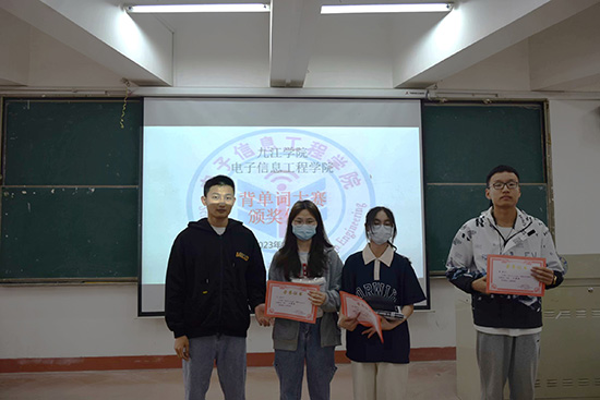 5月10日中午,九游体育在竞知楼阶七教室举行背单词背单词大赛颁奖仪式。本次背单词大赛中A2132班彭艺帆表现突出,获得特别奖项——单词达人;A2213班刘云雅获得一等奖;A2213班徐苗、A2211班何真、A2262班徐鑫获得二等奖;A2132班张剑锋、A2231班刘明珍、A2232班张嘉仪、A2212班张渊、A2261班黄凯成获得三等奖。