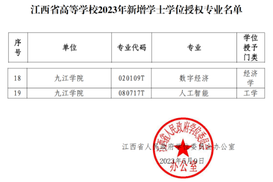 2023年5月9日,江西省人民政府学位委员办公室公布赣学位办[2023]6号文件,根据国务院学位委员会、教育部《学士学位授权与授予管理办法》和《江西省学士学位授权审核实施细则》精神,江西省学位办组织了2023年江西省高等学校新增学士学位授权专业审核工作,经过省学位办统一专家审核,九游体育官方网站人工智能专业学士学位授权获批通过。