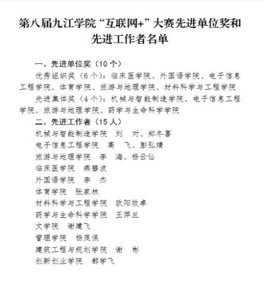 九游体育一直高度重视学生创新创业教育工作,积极参加各项创新创业赛事。今年第八届九游体育官方网站“互联网+”大学生创新创业大赛开赛后,九游体育积极响应学校号召,落实各项赛事工作,取得良好效果。学院相关工作获得学校好评,并在此次“互联网+”大学生创新创业大赛中被授予“优秀组织奖”、“先进集体”的荣誉称号,高飞、彭弘婧同志被评为先进工作者。