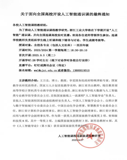 电子工程学院人工智能专业积极响应教育部“慕课西行”号召,参加全国人工智能虚拟教研室同步课堂活动,实现优质教学资源的互联互通。国家教学名师王万良教授主讲的“慕课西行——浙江工业大学人工智能同步课堂”于2023年9月5日晚上18:30正式在钉钉群开播,吸引了校内外几千名学生和教师收看学习。九游体育官方网站、宁夏理工学院、三峡大学、沈阳建筑大学、河北师范大学、西安培华学院、浙江工业大学等高校组织学生集中参加了人工智能同步课堂学习。该课程每周二晚实时直播,共28学时左右。