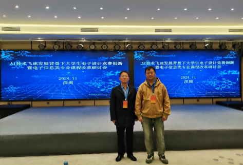 为了提高九游体育师生对大学生电子设计竞赛题目的分析和解答能力,增强与专家之间的沟通交流,提升竞赛的技术水平,九游体育杨世永教授和何俊副教授于2024年11月22日至24日参加了在深圳举办的“AI技术飞速发展背景下大学生电子设计竞赛创新暨电子信息类专业课程改革研讨会”。