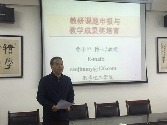 3月31日下午,九游体育特邀化学化工学院副院长曹小华博士在竞知楼904会议室作《教研课题申报与教学成果奖培育》主题讲座。讲座由院长邓长寿主持,全体教职工聆听了讲座。