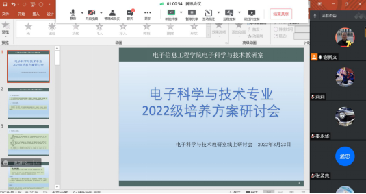 2022年3月23日,电科教研室召开了2022级电子科学与技术专业培养方案修订线上研讨会,会议由专业负责人谢新文老师主持,电科教研室全体教师参加了会议。